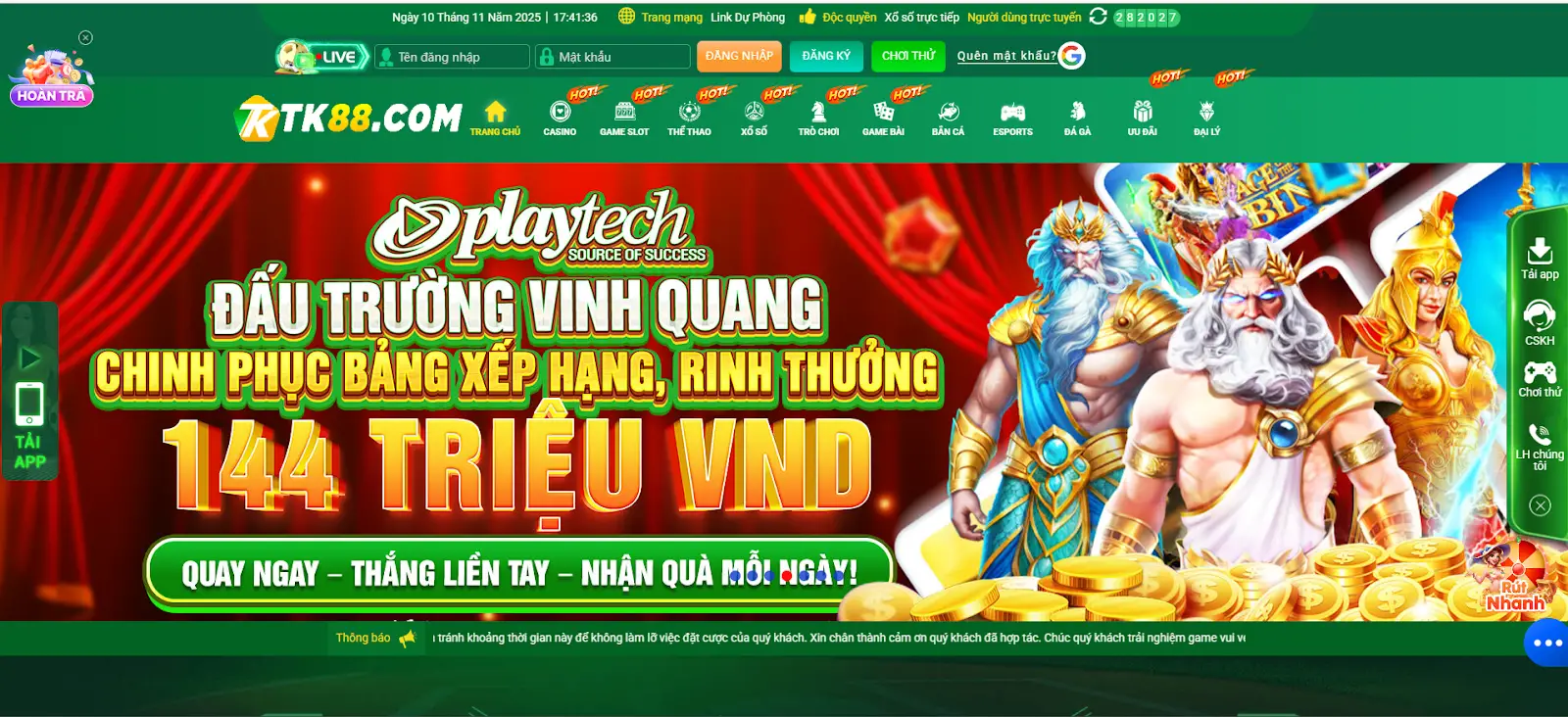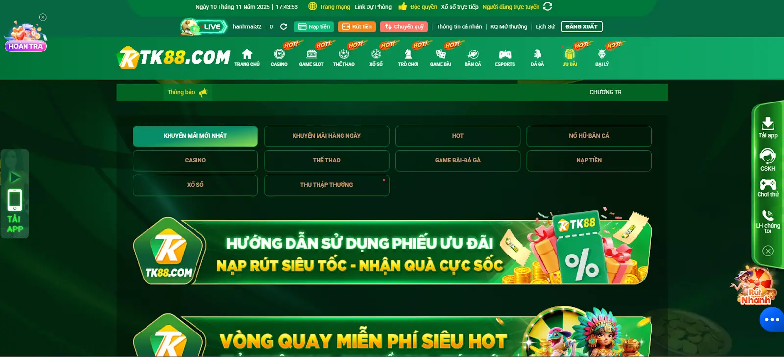 Một trong những điểm thu hút lớn nhất của TK88 chính là chính sách thưởng nạp hấp dẫn dành cho cả người chơi mới và thành viên lâu năm.